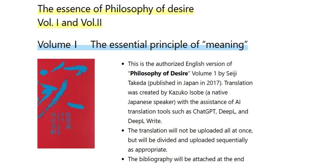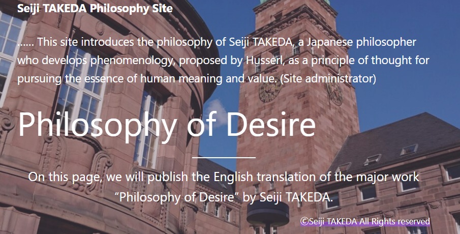・竹田哲学を世界へと発信するサイト。コンテンツのメインは翻訳家・磯部和子氏とタイアップして取り組む主著『欲望論』の「完全英訳」です。順次公開予定でまず第1部「存在と認識」第1章「哲学の問い」がUPされています。